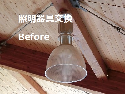 すみません。施工前を消灯で撮ってしまったのでより暗く見えてしまってます。(決して意図的ではありません)交換前の水銀灯照明は点灯時はもっと明るいです。計測器だとおおよそ600ルクスでした。