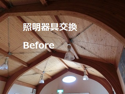 市町村の案件で、公民館の天井に設置された天吊りの水銀灯照明8台を撤去。